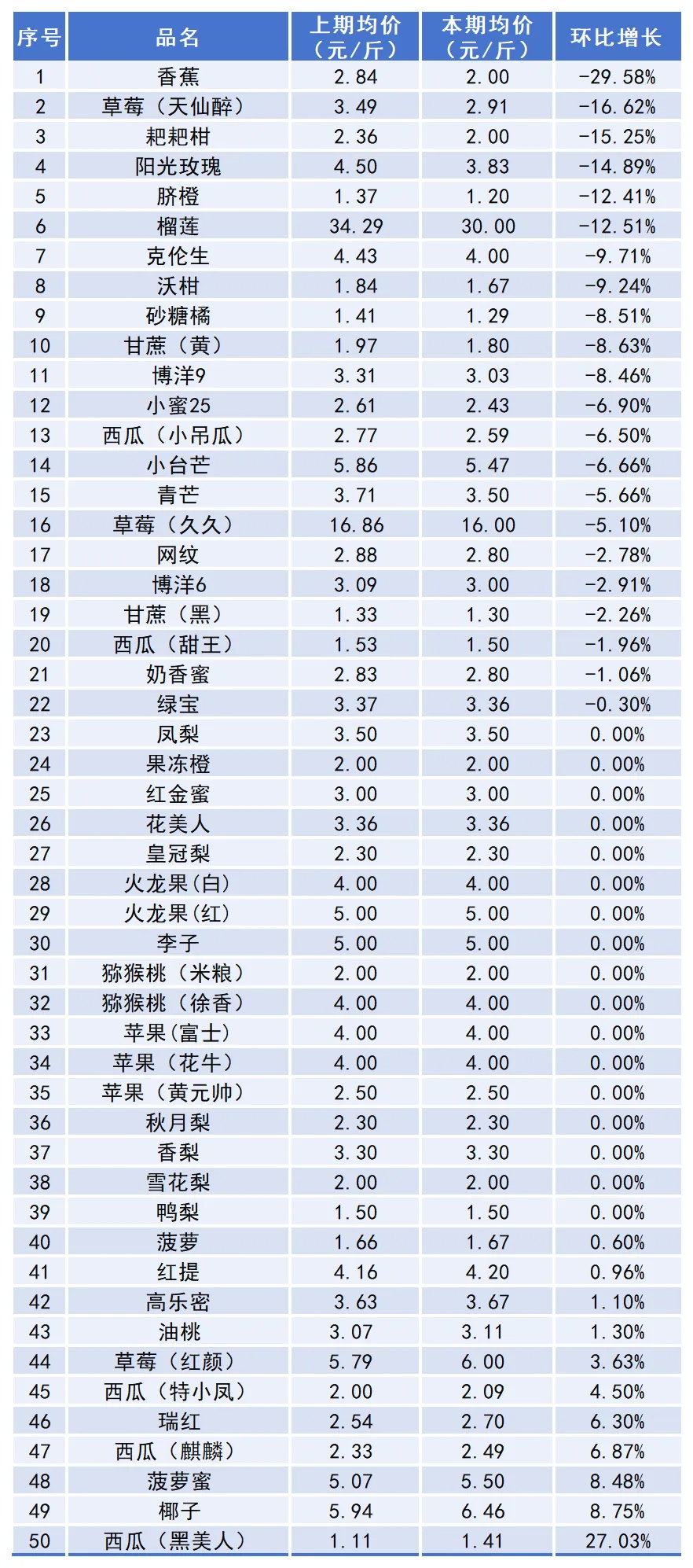 从具体水果品种来看,价格上涨的有11种,价格下跌的有22种,价格持平的有17种。