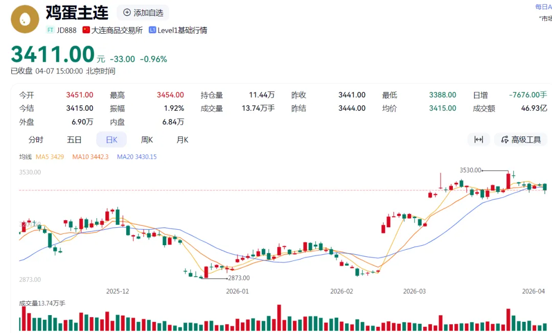 高开 3451,最高冲 3454 后回落,最低下探 3388,最终收 3411,收出小阴线。