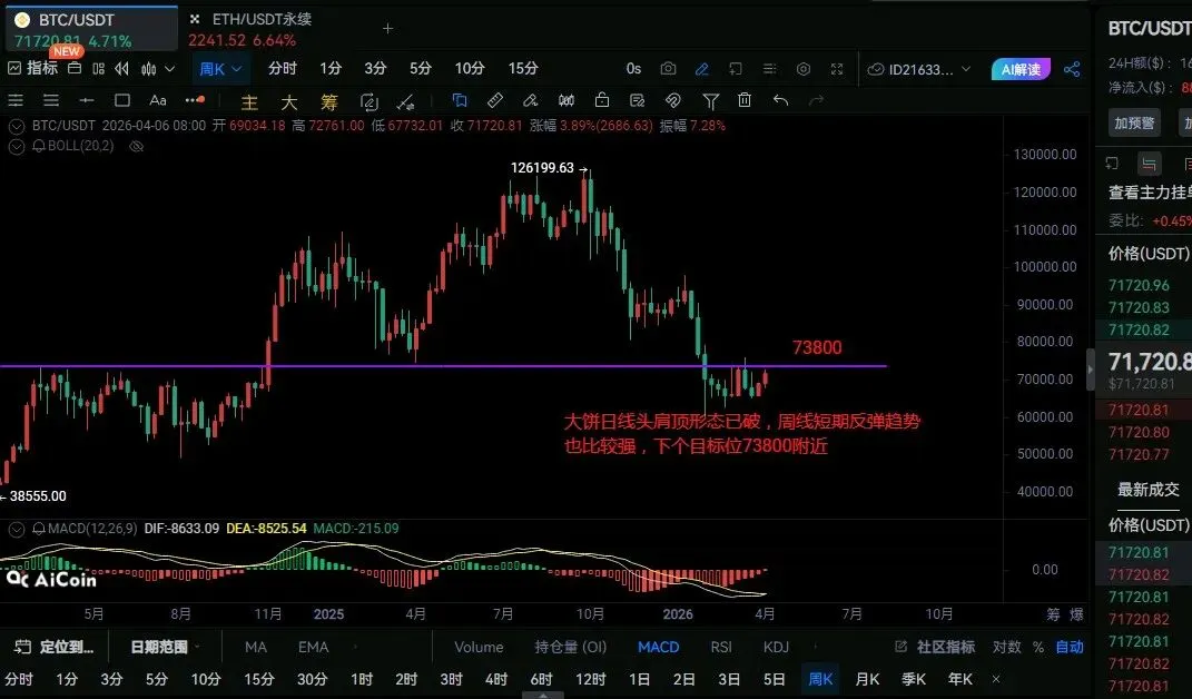 大饼行情分析:日线头肩顶形态已破,周线短期反弹趋势强劲,价格处于反弹上行通道中。周线指标MACD绿柱持续缩短,空头动能大幅衰减,多头反弹动能充足;只要守住69300支撑,将延续反弹冲击73800,若突破则打开更大上行空间;若跌破69300则反弹趋势不成立。