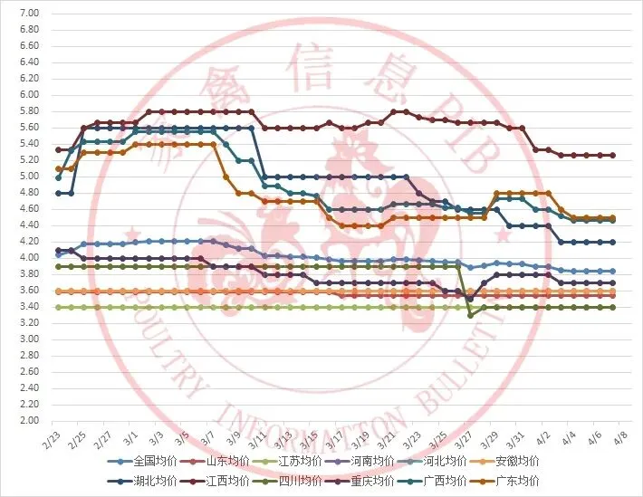 2026年2月23日-2026年4月8日主流地区白羽鸭毛鸭均价走势图