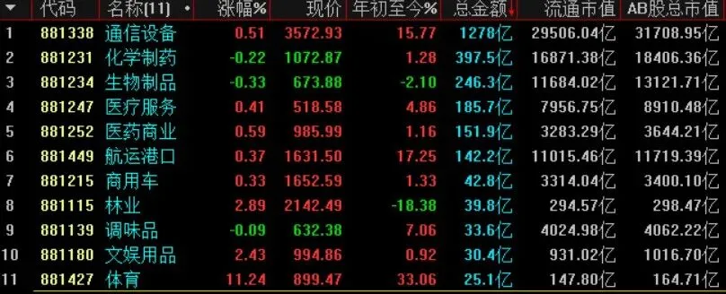 通达信127个二级行业,板块RPS三线翻红、成交金额大于200亿的板块有通信设备、化学制药、生物制品。(底板为蓝色是因为RPS三线翻红公式筛选的结果设置的颜色,非自选)