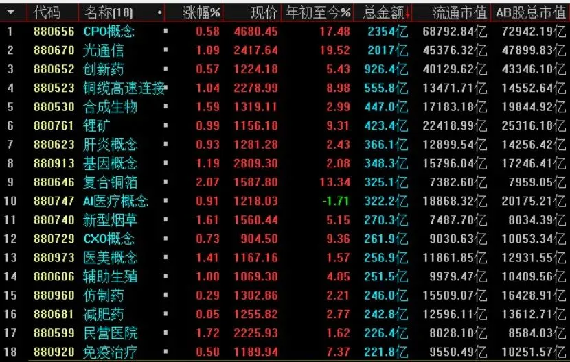通达信概念板块,板块RPS三线翻红,成交金额大于200亿的如下图所示。(底板为蓝色是因为RPS三线翻红公式筛选的结果设置的颜色,非自选)