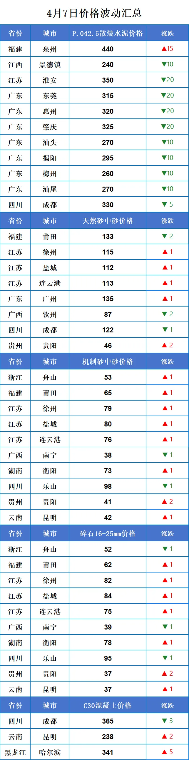 4月7日全国水泥行情以跌为主,跌价地区集中在广东。
