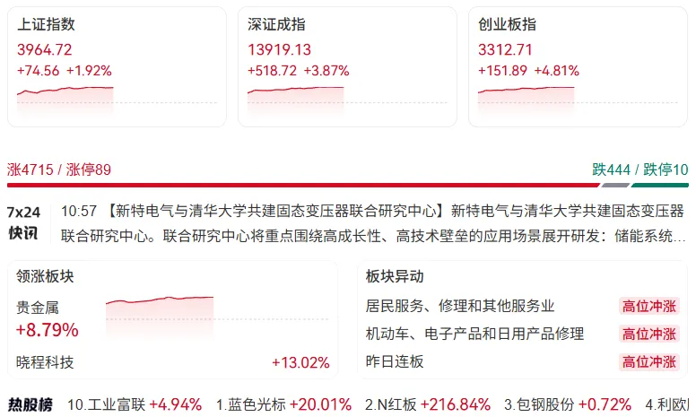 今日(2026年4月8日上午收盘)A股行情呈现三大指数集体高开、放量大涨的态势,上证指数最终收盘上涨至3964.72点。