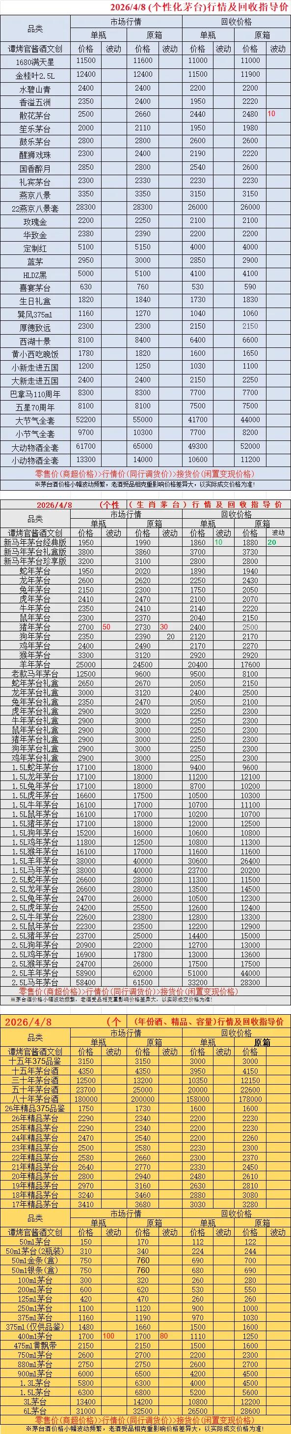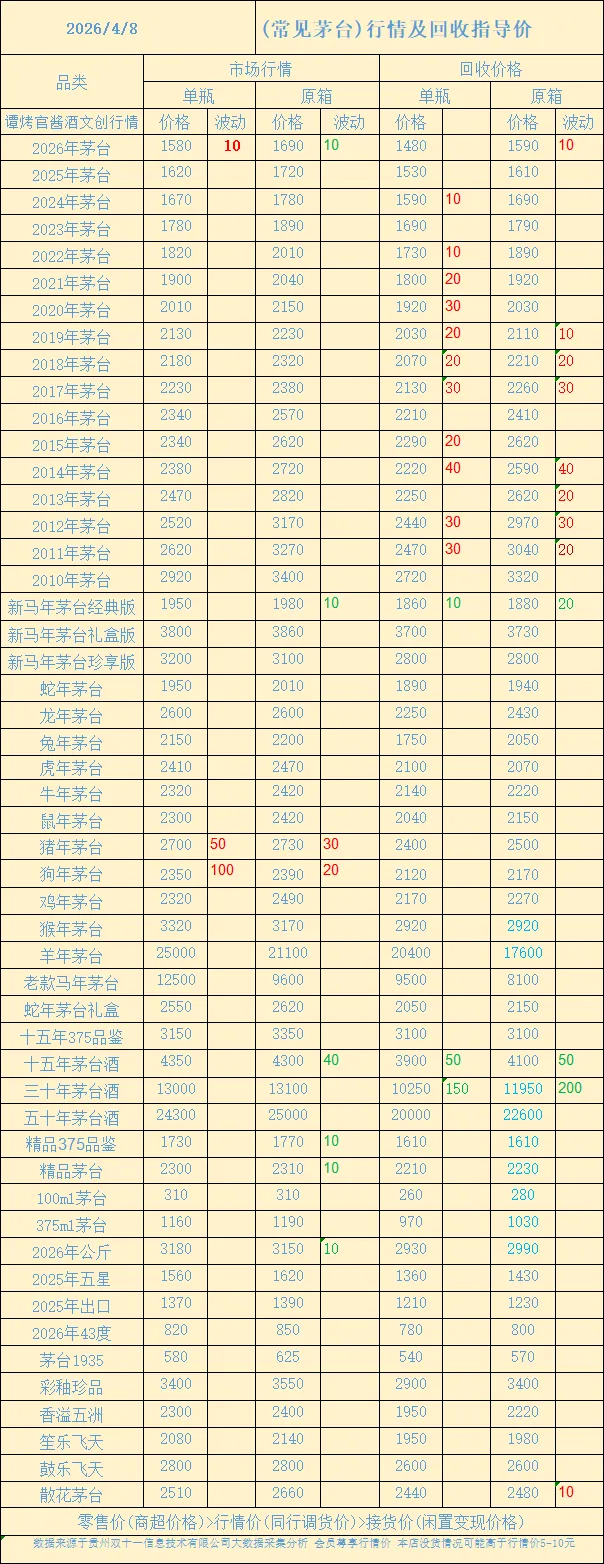 今天是2026年4月8日星期三,与昨日行情相比:常规茅台中:2026年飞天原箱6瓶装,飞天1L,精品茅台,精品375ml品鉴装,十五年年份酒,十五年年份酒375ml品鉴装下跌;2026年飞天散瓶上涨。生肖茅台中:丙午马年经典版下跌;猪年生肖原箱和散瓶、狗年生肖原箱和散瓶上涨。特殊容量飞天中:400ml原箱和散瓶上涨,回收参考价常规茅台中:2011年小件原箱和散瓶飞天、2012小件原箱飞天和散瓶、2013年散瓶飞天、2014年小件原箱和散瓶飞天、2015年小件原箱飞天、2017年小件原箱和散瓶飞天、2018年小件原箱和散瓶飞天、2019年小件原箱和散瓶飞天、2020年散瓶飞天、2021年散瓶飞天、2022年散瓶飞天、2024年散瓶飞天、2026年小件原箱飞天涨价,生肖茅台中:经典马茅原箱和散瓶跌价,年份茅台中:15年原箱和散瓶、30年原箱和散瓶跌价,个性化茅台中:散花飞天原箱涨价。