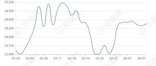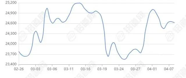 2026年04月08日上海期货行情价24620涨跌+45,最低24395,最高24690,前三日均价24640,前五日均价24694。