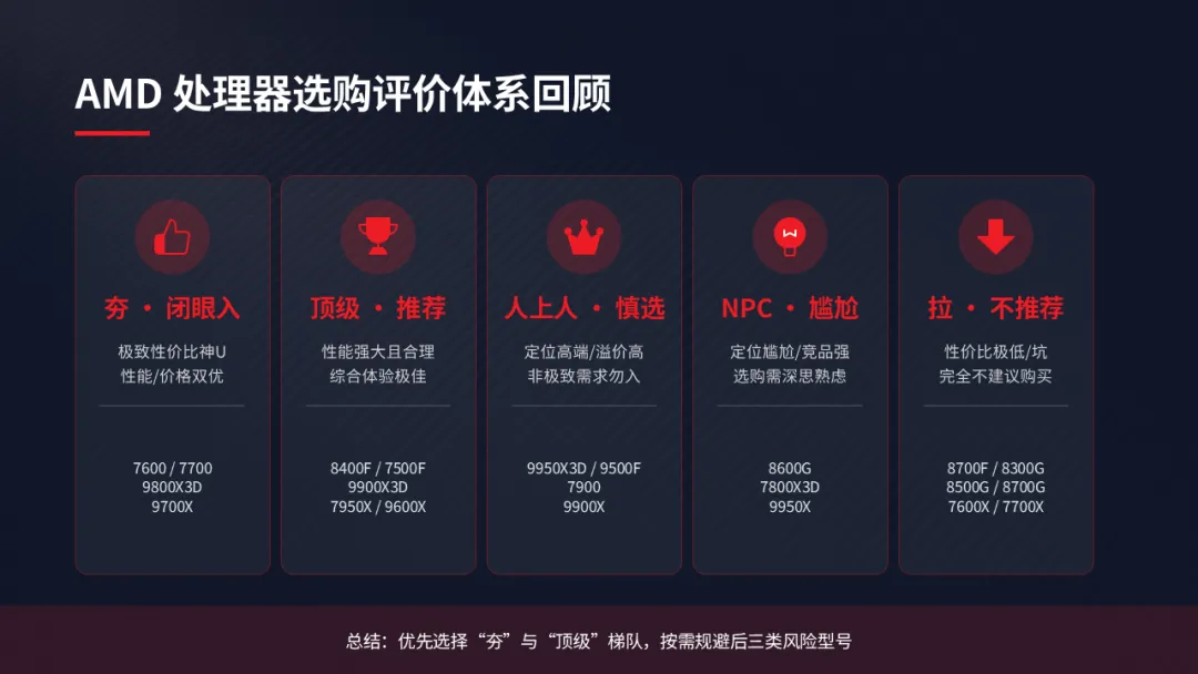 当前约980元,单核性能极强。游戏性能秒杀5500X3D。在同价位下,没有多核瓶颈时,单核性能高的体验提升最明显。如果和7700相比我选这个6核的新架构。体质较差的9600,性能差7%,价格便宜10%。少个核显,但因为没像7500F那样烂大街,二手市场认可度低。二手最低1350元的时候真香。游戏性能极其出色,没让X3D出手就压得Intel从14代-15代喘不过气。这两款U买来肯定是为了多核性能,但现在面临Intel Ultra的虎视眈眈。9900X (人上人):对标Ultra 7 265K,单多核都不占优,且265K还有个媲美1050Ti的核显,价格还便宜近500。9950X (NPC):对标Ultra 9 270K,同样单多核不占优,二手市场270K还要便宜500元。这当然是AMD的伟大胜利,因为它终于让玩家用上了便宜的Intel!所以现在,我们要为Intel加油,好让我们未来用上更便宜的AMD。