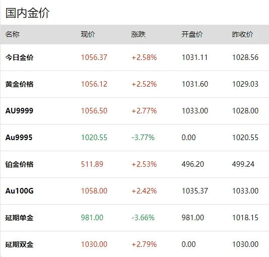 - 今日金价现价 1056.37 元 / 克,涨幅 2.58%;AU9999(足金 9999)现价 1056.50 元 / 克,涨幅 2.77%,为国内黄金品类涨幅最高;Au100G 现价 1058.00 元 / 克,涨幅 2.42%;铂金价格同步上涨 2.53% 至 511.89 元 / 克。