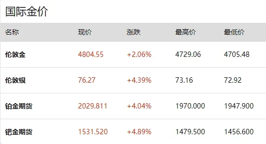 - 伦敦金现价 4804.55,涨幅 2.06%;伦敦银现价 76.27,涨幅 4.39%;铂金期货、钯金期货涨幅分别达 4.04%、4.89%。