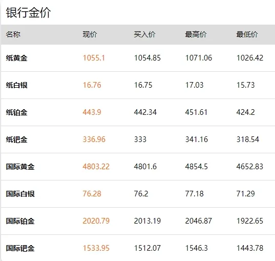- 纸黄金现价 1055.1 元 / 克,纸白银现价 16.76 元 / 克;国际黄金现价 4803.22,国际白银现价 76.28,与国际市场价格完全联动。