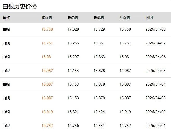 - 4 月 1 日白银收盘 16.752,4 月 2 日回落至 15.919,随后震荡调整,4 月 8 日收盘 16.758,创近 8 个交易日新高。