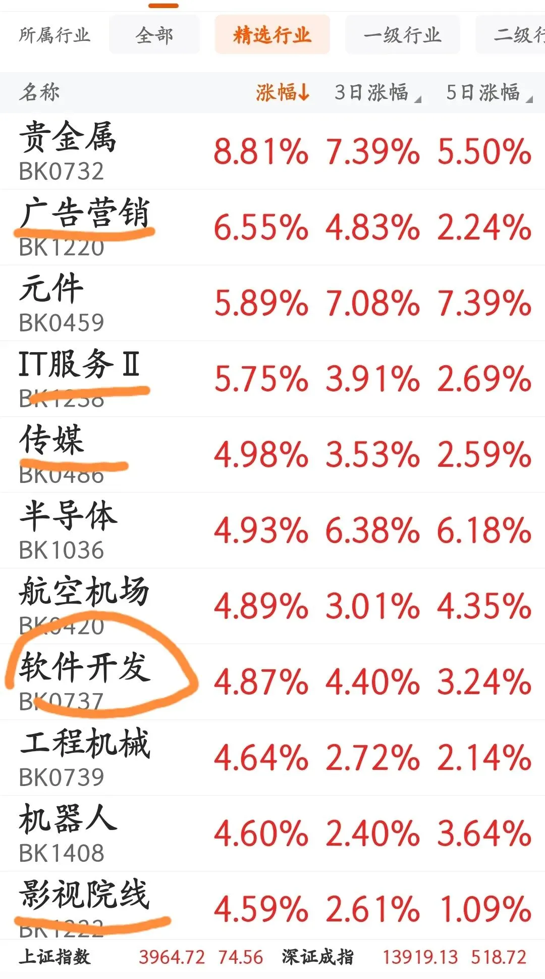 包括软件和互联网在内的AI应用股真的如媒体上说的没有行情吗?我看未必。逻辑就两点:算力发展终极目的是算力应用,没有算力的应用,算力发展就没有了需求依据;AI应用概念板块的股价处于历史低位,如软件开发、互联网、电商、影视院线、信息技术服务等股价都在历史低位,从资金博弈角度看它们都有望走出一波行情。今天上午盘涨幅榜排名就可以看出来,这些板块排在涨幅榜前面,说明是得到资金认可的,前段时间唱空就是为了低位吸筹,是自己机构与媒体配合鼓动散户低位交出筹码的阴谋。