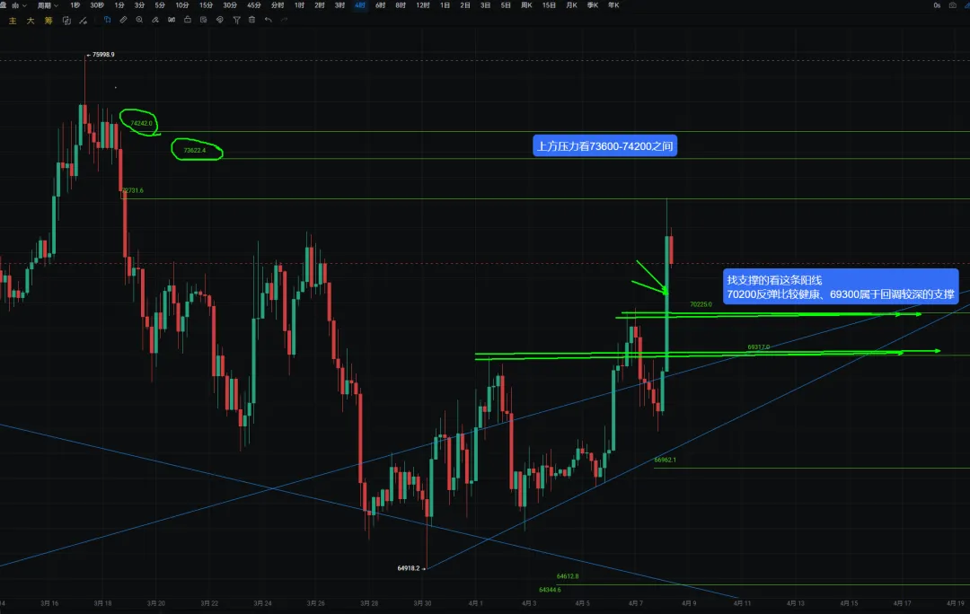 4.8日行情分析:意料外的拉升,能否诞生意料外的行情?消息面影响的行情,基本上很多B友是懵逼的没有任何准备的,庄的这波操盘手法也是非常牛批了,急拉打了所有人一个措手不及,补了4小时的缺口顺便对前面72000的高点做假突破,高,实在是高。那么意料外的拉升,能否带来意料外的持续性趋势行情,就当前日线来说,还需要连阳的走出,否则当前在日线上轨的位置有可能是诱多导致后续回调,所以当前又到了十字路口,是连阳走出拉升,还是诱多完毕继续割韭菜,我们来关注几个关键位置。$BTC 首先在大饼上,有效的支撑要看4小时这根阳线,即先是70200的位置是否反弹,较深的支撑在69300。如果以上两个位置回调到位后失守,就要留意行情继续下杀了。上方压力在73600-74200的区间,继续把这个位置站好,短期的新高点就有戏了。