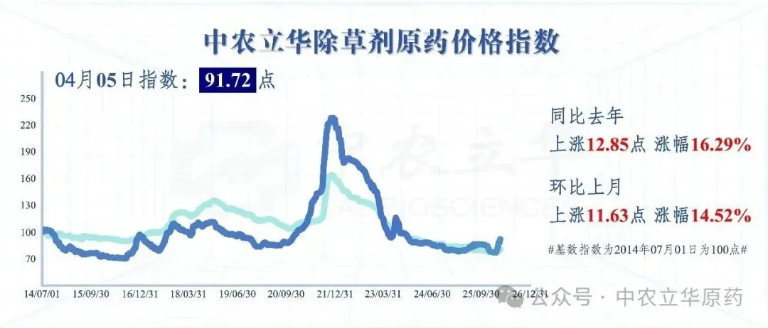 2026年4月5日,中农立华除草剂原药价格指数报91.72点,同比去年上涨16.29%,环比上月上涨14.52%。