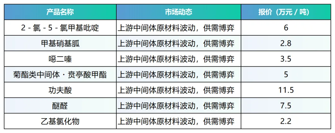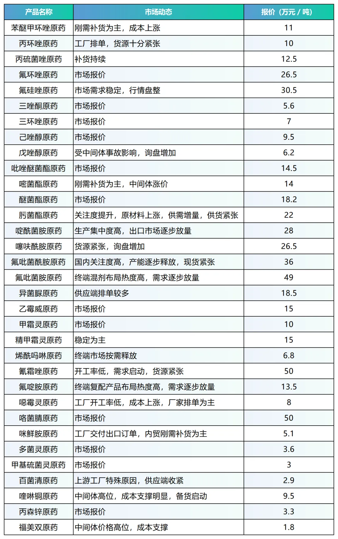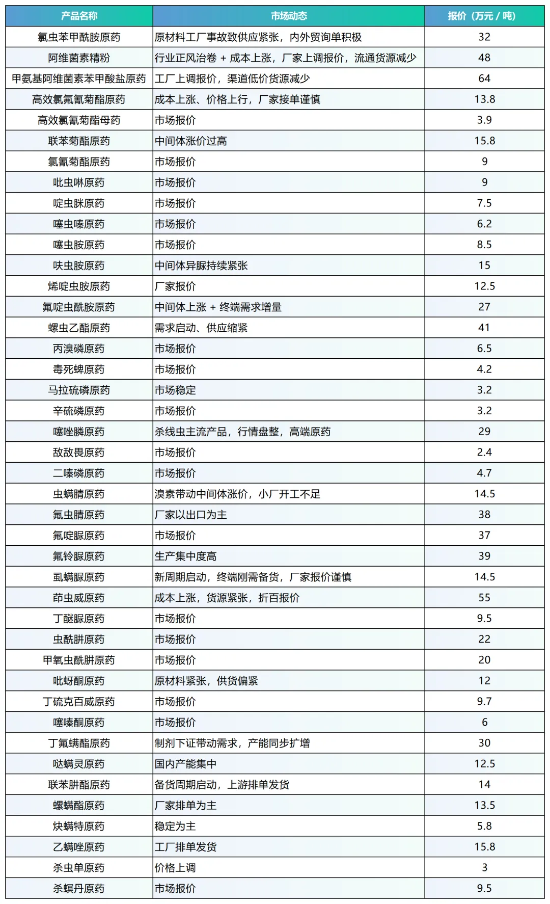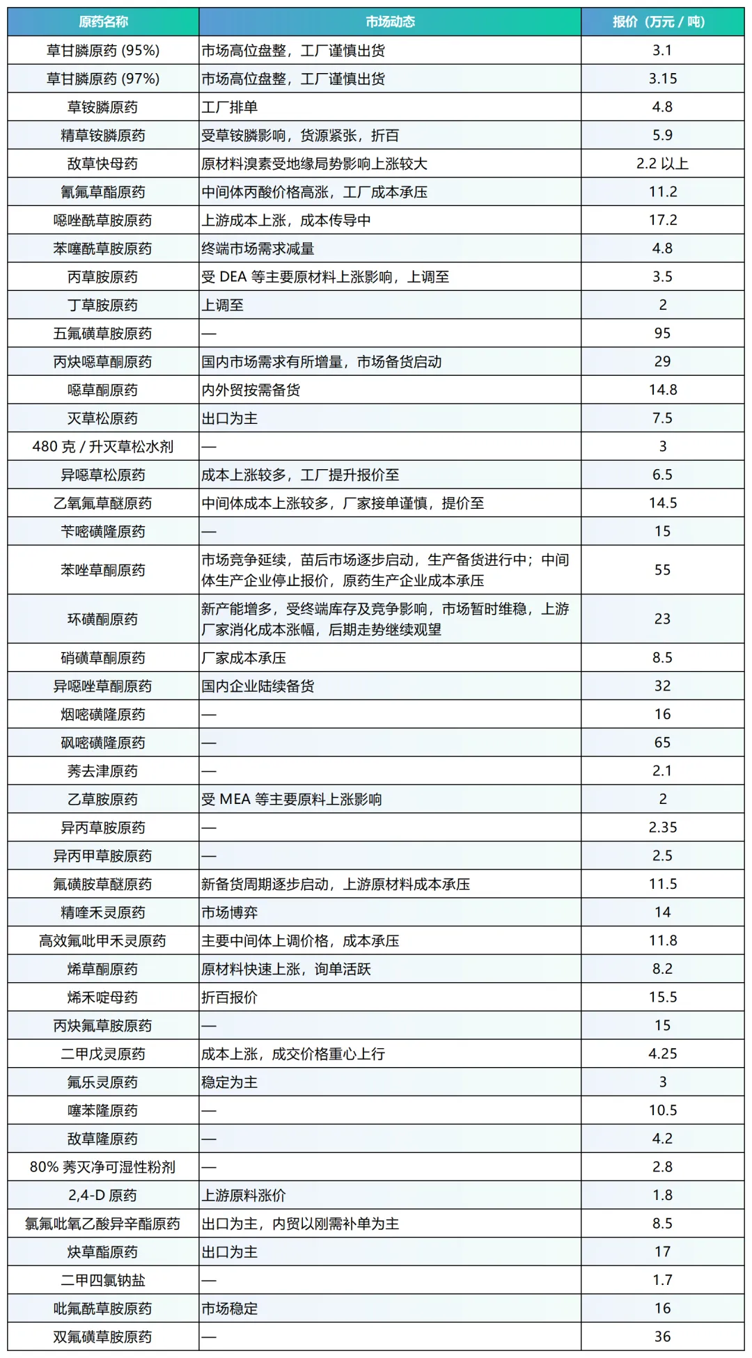 综上,本周农药原药行情核心围绕能源成本波动、工艺供给风险、应季需求叠加释放三大供需主线运行,多数品类受成本支撑与供给收紧影响,价格坚挺,部分刚需品种成交活跃度提升。地缘冲突带来的能源不确定性仍将持续,短期内原料成本难有明显回落。全球春耕备货需求逐步释放,海外采购意向稳步回暖,行业中长期需求基本面具备支撑。预计短期内原药市场将延续上涨态势,后续需重点跟踪能源价格走势、行业安全管控进度及需求释放情况,及时把握供需格局变化带来的行情机遇。