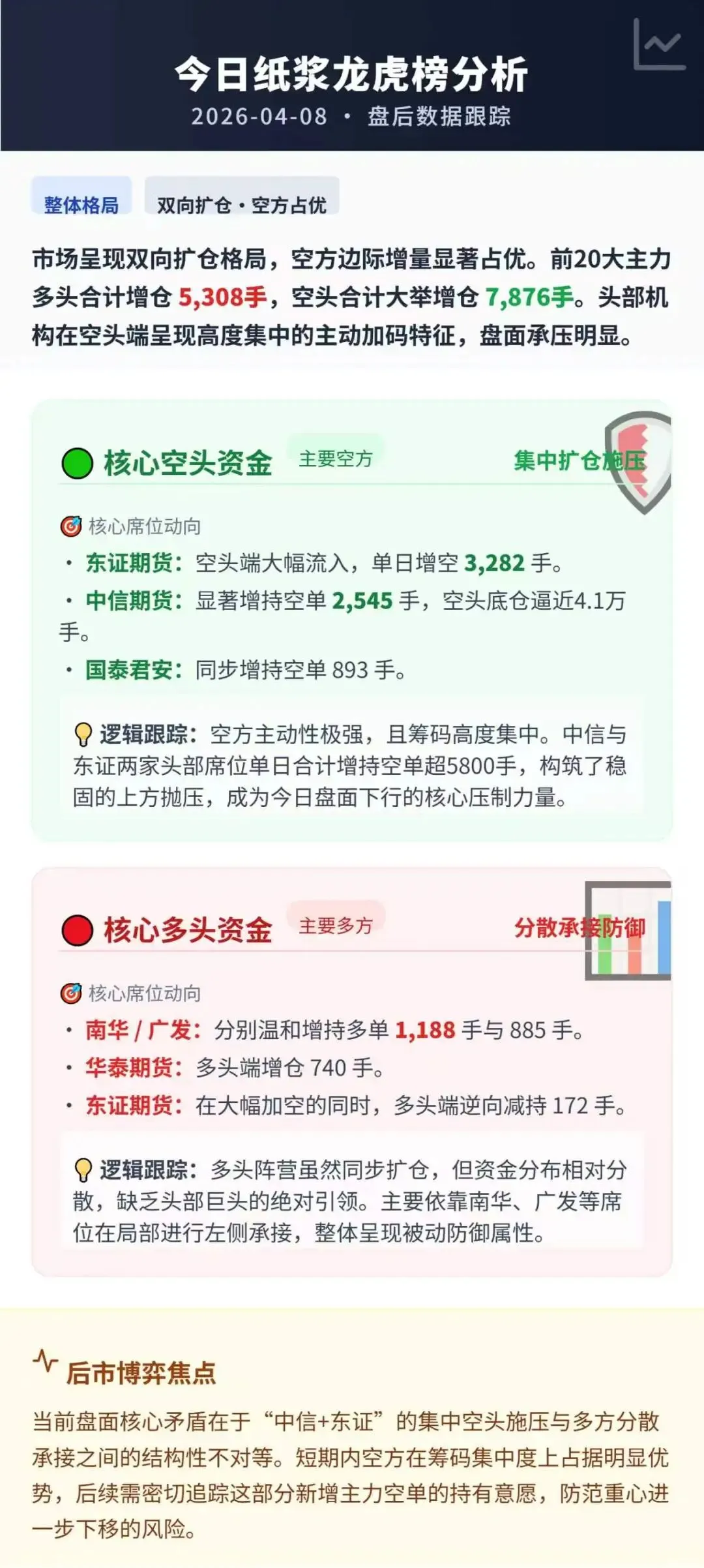 市场摘要:今日纸浆SP05合约区间震荡,针叶青岛银星现货报价05+20附近,常熟银星基差略涨至05+70附近,刚需点价成交。阔叶桉木报价维稳在4600附近,实单实谈。期货端头部机构在空头端呈现高度集中的主动加码特征,盘面承压明显。