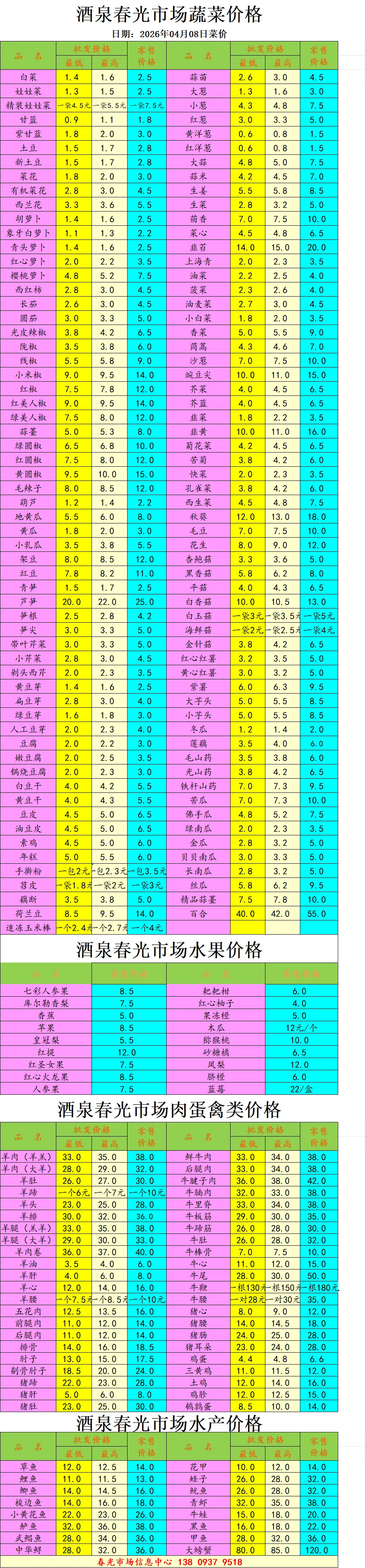 >【今日菜价】甘肃酒泉春光市场价格行情202 6年4月8日