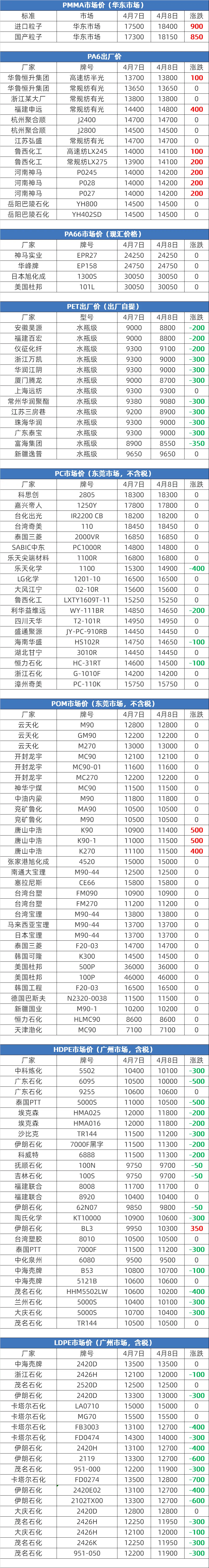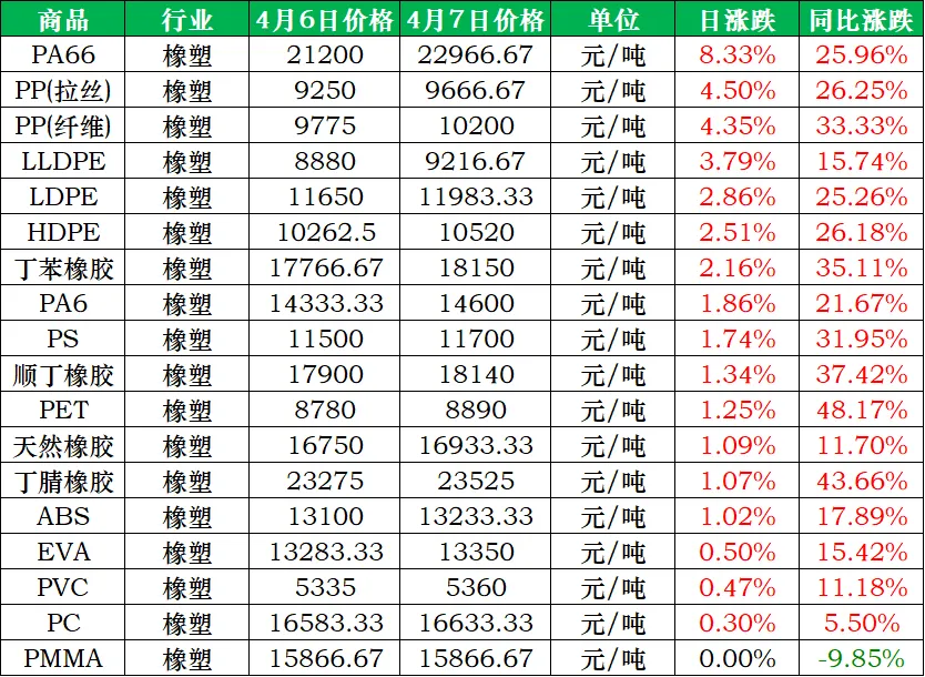 2026年4月7日大宗商品价格涨跌榜中橡塑板块环比上升的商品共17种,其中涨幅5%以上的商品共1种,占该板块被监测商品数的5.6%;涨幅前3的商品分别为PA66(8.33%)、PP(拉丝)(4.50%)、PP(纤维)(4.35%)。
