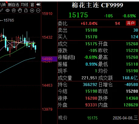 4月8日,郑棉主力2605合约报收于15175元/吨,跌105元/吨。