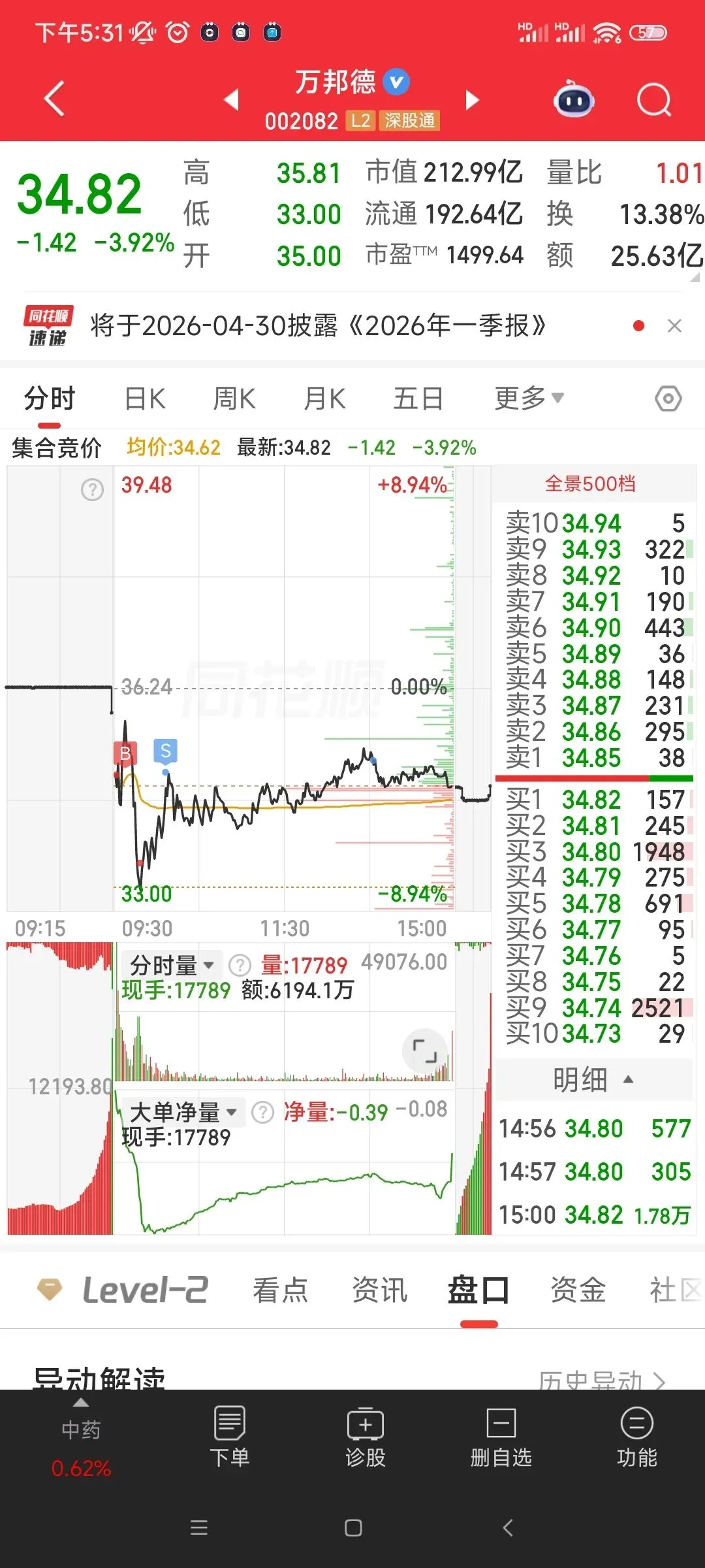 万邦德的话就是正常做t了,开盘吸了一笔,-7又吸了一笔,后面拉高慢慢出。为什么进药断板的情况下还敢买万邦德?一个是前面说的美诺华和金陵涨停说明创新药没退潮。一个是万邦德今天量能也不错,接近平量阴。而且万邦德之前发过业绩预告的,业绩还行。那么今天这种行情下,早上那波杀跌到跌停的可能性就很低,所以胆子大又吸了一笔。其实像今天这种行情,能跌停的无外乎就几种,逻辑证伪或者公司暴雷。逻辑证伪就比如抄石油原油这些和战争相关的,战争一停逻辑就没了。公司暴雷就是什么立案了,被抓了,公司违规之类的。万邦德都没有。而且最关键的,最高版进药进监管都没跌停,万邦德又没进监管凭啥能跌停。