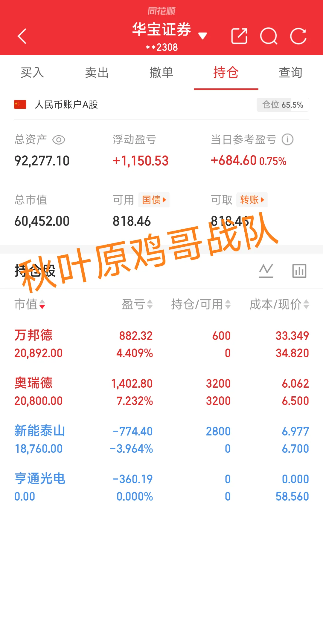 持仓上,昨天三个票,万邦德,亨通,奥瑞德。奥瑞德开盘秒板就没操作了。亨通开盘一路砸,接近0轴全卖了。然后切了新能,买的理由是光纤前排热门票。而且3进4这个板数也不算高,以为今天行情好能封住的。没想到被进药带下来了。进药这个7进8失败,对短线连板情绪影响不小。但是光纤这个题材本身还是可以的。所以也是这个缘故,下午新能又冲了几次。明天看看如果能走一个爆量阴断板反包模型就接着拿,不然按照纪律就该清了。