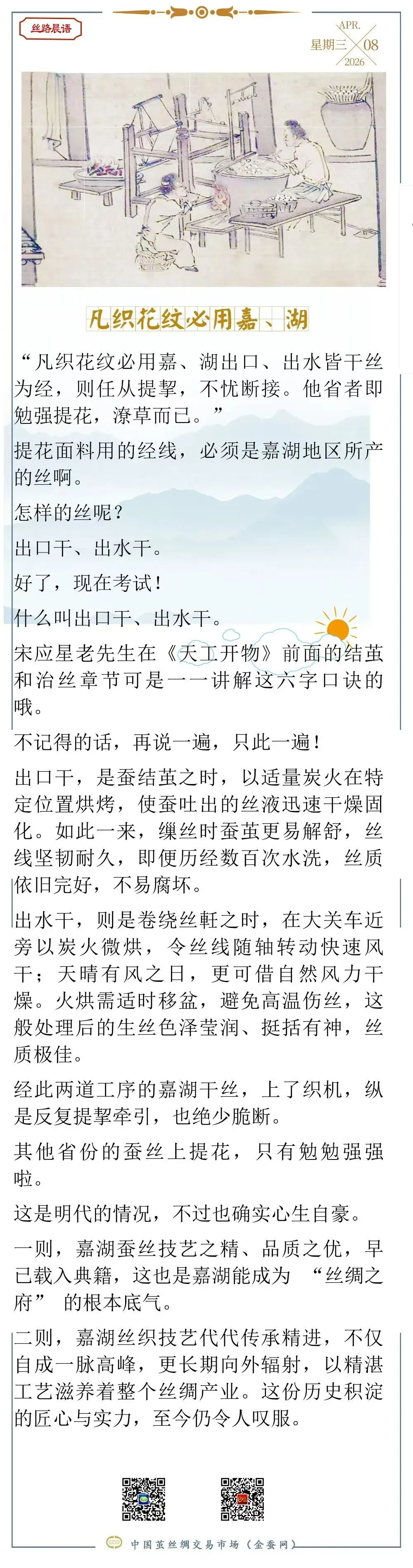 为落实纤维质量监测机构能力提升三年行动部署,加强生丝公证检验质量控制,巩固纤维检验队伍素质能力,3月31日至4月2日,2026年全国生丝质量检验技术比对交流活动在山东省泰安市举办。