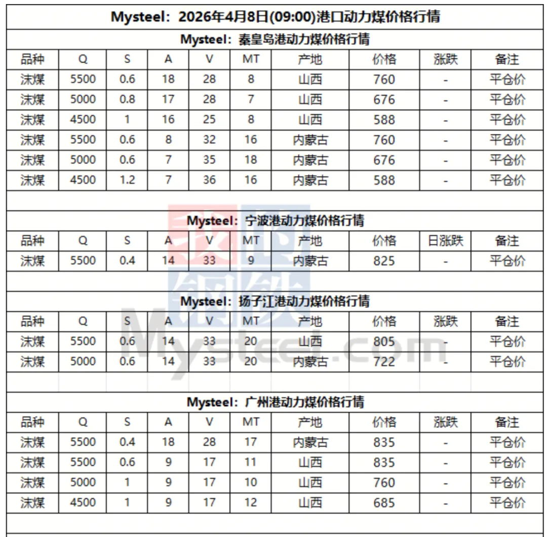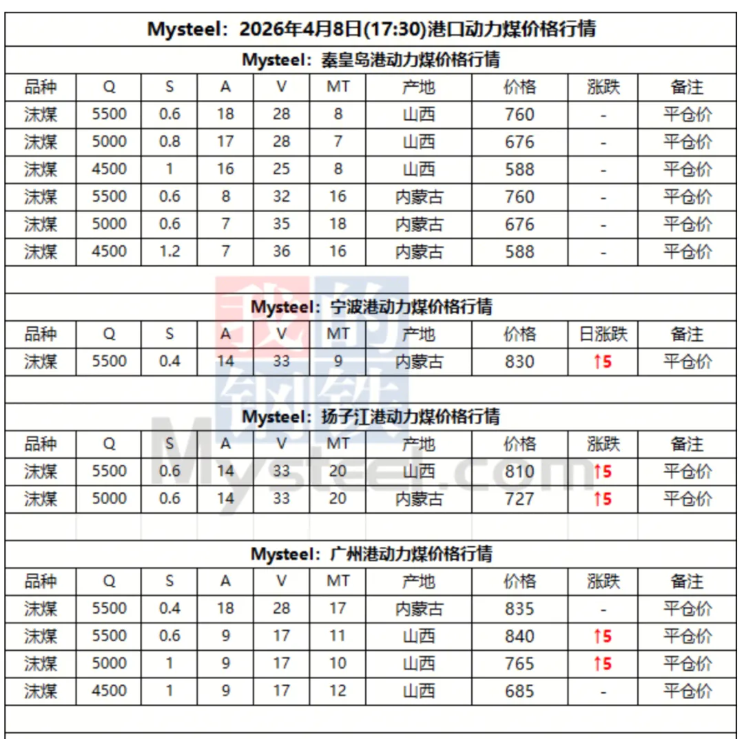 8日港口动力煤报价偏稳运行。市场情绪稍有好转,大秦线检修,北港库存下降,部分贸易商报价小幅上调,低价出货意愿不高。但终端采购计划并未明显放量,少量询货仍以压价为主。整体市场交投氛围冷清,成交稀少,操作仍以谨慎观望为主。后市需持续关注下游需求变化及港口实际成交情况。