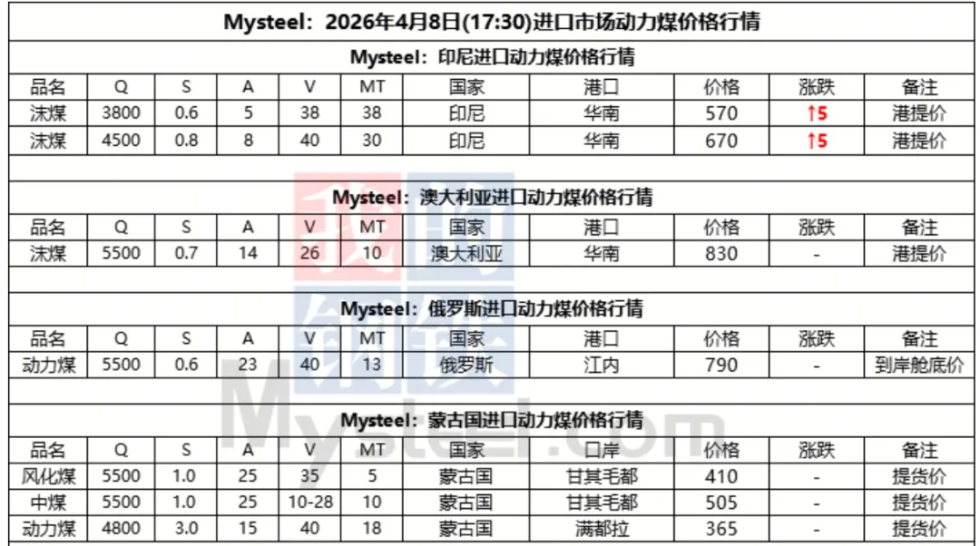 8日进口市场动力煤价格以稳为主。进口市场报盘较为坚挺,印尼Q3800巴拿马船型FOB巴拿马船型报盘区间基本在61-63美元/吨,下游询盘较少且还盘力度较大,实际成交困难。需求端暂无全面释放,国内终端采购多以刚需补库,成本高位运行下市场采购新货意愿较低,整体交投态势延续僵持运行,多数贸易商暂缓操作,观望为主。预计短期内进口动力煤市场价格延续以稳运行,后市需持续关注外矿报盘及终端采购节奏等情况。