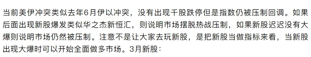 去年6月伊以冲突宣布停战后市场进入两个月主升行情,这段行情称为624行情,区别于前年的924行情。今年所有的炒作都大幅提前,电力提前2个月炒作,苏超提前3个月炒作,对应去年624中线行情也应该大幅提前。624行情始于伊以停战,目前是美伊停战,精准对应。注意10号的谈判结果,如果美国最终答应对伊朗赔款允许浓缩铀等条件,相当于美国认输中俄伊阵营取得重大胜利。按照上一篇文章的解析,新股代表最大弹性做多,市场摆脱利空压制开启主升的标志是新股爆发,新股爆发的标准是出现快速翻倍及以上。新股大爆后可以开始全面做多市场,而且是中线级别。华之杰新恒汇去年6月20日上市,这一天伊以激战达到顶峰。23日伊以停战,23日对应这两只新股次日,收红,之后3天翻倍。新股爆发后整个市场开启为期两个月的主升浪。本文纯逻辑梳理非荐股无法作为买卖依据,阅读文章只看逻辑即可,不用关注涉及的股票,股票仅为举例说明。股市有风险,入市需谨慎,逻辑存在无法兑现的可能性。