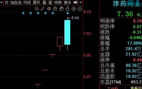 津药YY开盘略微抵抗后,就从涨停回落到水下-4个点。