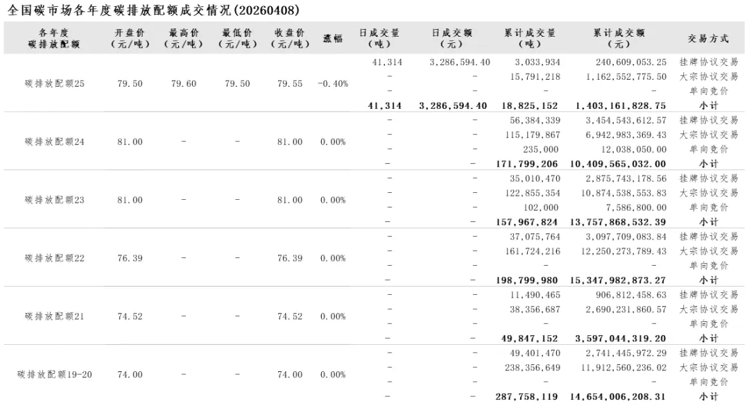 2026年1月1日至4月8日,全国碳市场碳排放配额成交量20,130,913吨,成交额1,507,010,562.35元。