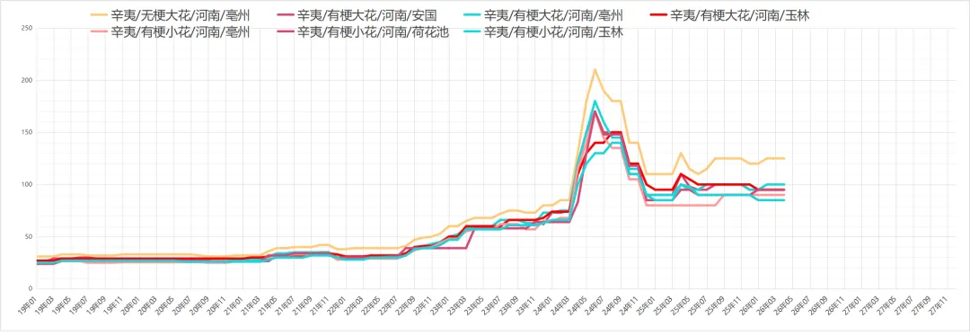 辛夷花行情保持平稳,近期市场商家关注力度一般,货源走销以按需购进为主,持货商家出售意愿较强,现河南无柄大花货价格在120-125元,小花货价格在95-100元。