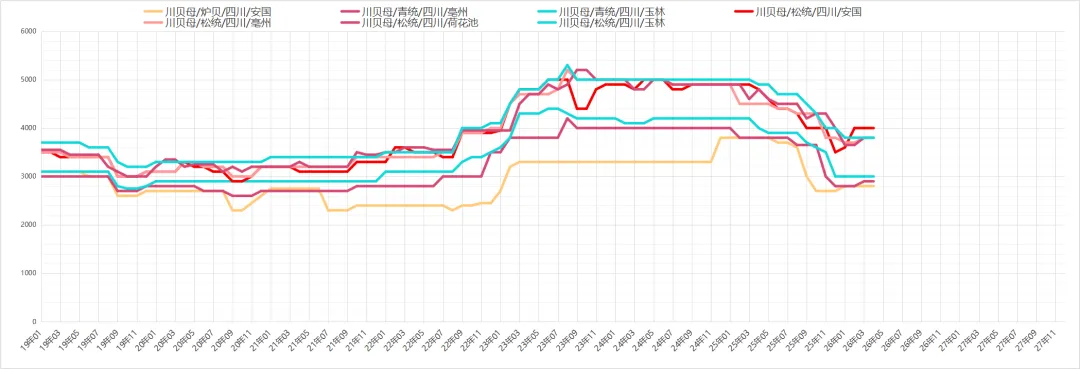 川贝母行情与前期保持平稳,可供货源有量,近期走销一般,现市场川贝母青贝1.0以下的货多报价在3000元,预计短期内行情不会有大的调整。
