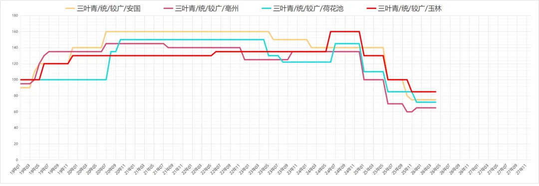 三叶青行情与前期保持平稳,可供货源充足,近期走销一般,商家关注力度一般,现市场三叶青多报价在80-90元之间。