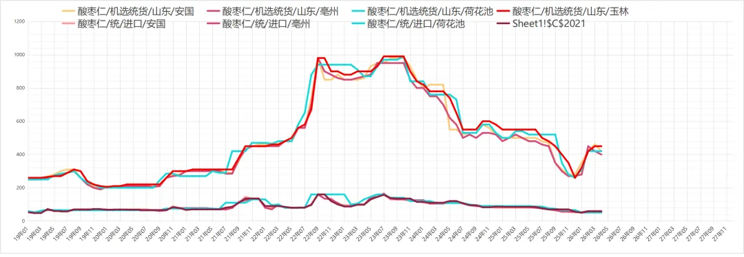 酸枣仁要价出现上调,受产地近日行情反弹,市场要价出现上调,目前市场国产98货多要价在430元,95货报价在410元左右,且此价与产地基本持平。