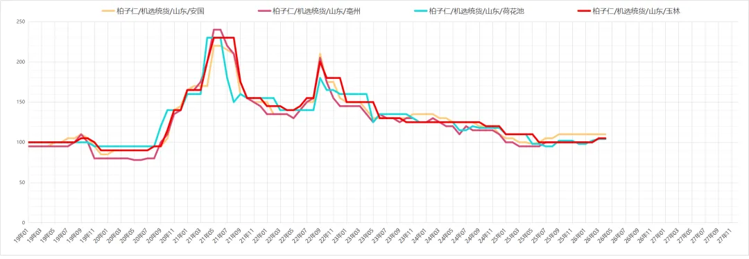 柏子仁行情暂时维稳,最近整体走货有所放缓,目前市场包检合格货多要价在110元左右,一般统货报价在100元左右。