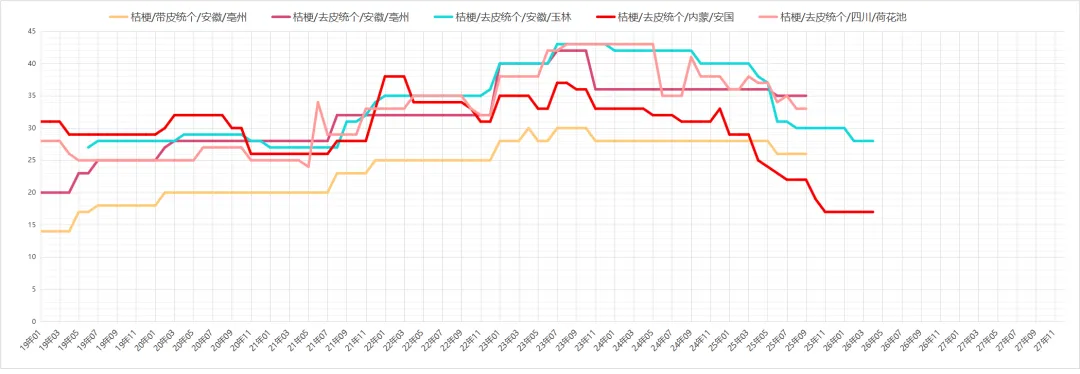 桔梗行情持续稳定运行,产区来货稳定,市场经营商家手中货足,货源以实际需求成交为主,走动较好,现内蒙货一般的价格在14-15元之间,安徽货27-28元。