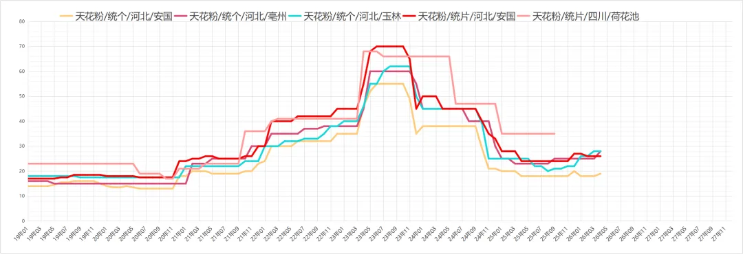 天花粉行情平稳,市场货源供求平衡,商家关注度不高,近期交易量有限,现一般统片价格在29-30元之间,较大片的40元左右。