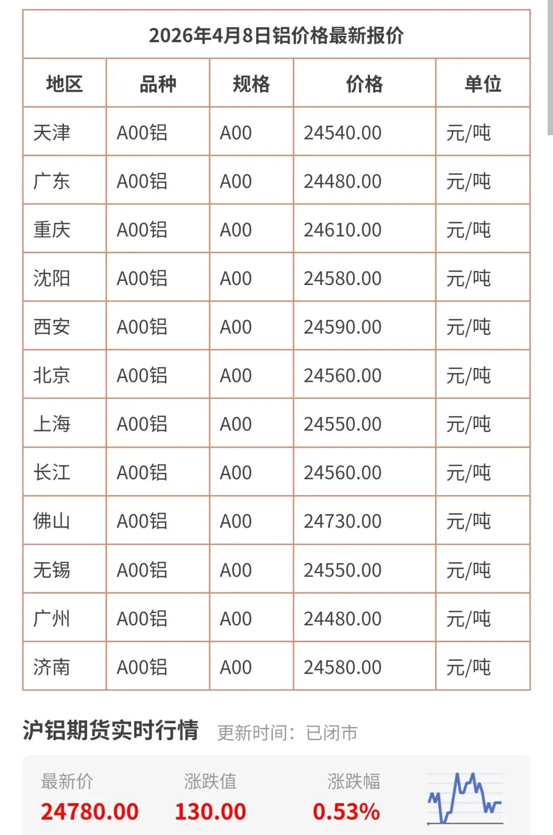 今天4月8日更新,今日铝价行情查询,包括天津、广州、上海、北京、无锡、广东、佛山等地区铝现货价格!长江有色铝锭最新价格是多少钱一公斤一览表