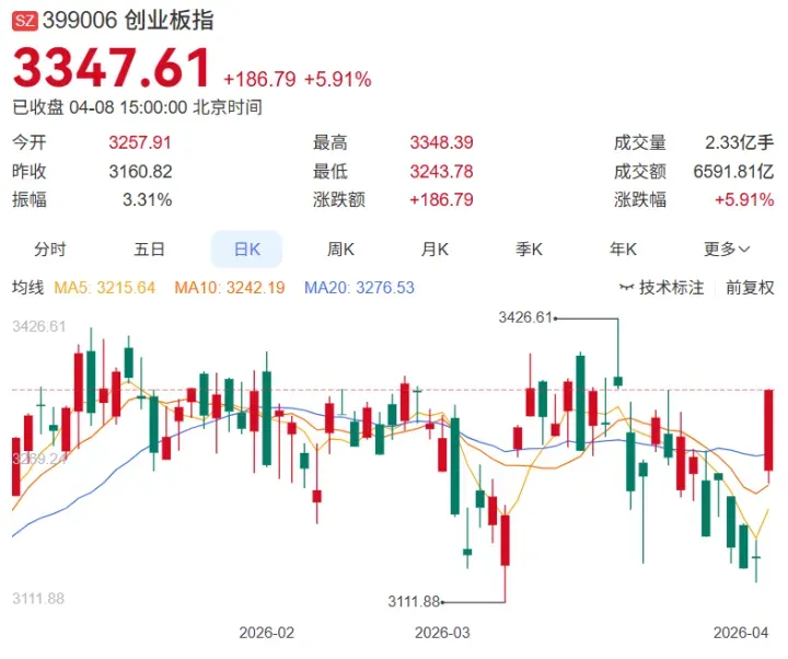 截至收盘,创业板指暴涨5.91%,上证指数和深圳成指的涨幅则分别达到2.7%和4.79%,两市超5100股上涨,合计成交量超过2.4万亿,较昨日大幅放量逾7000亿。