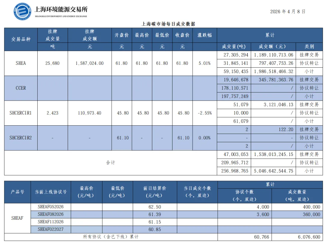 截至今日,上海碳市场所有现货品种累计成交量256,968,765 吨,累计成交金额5,046,642,544.75元。其中,配额累计成交59,150,435吨,成交金额1,986,518,466.32元;CCER累计成交197,757,249吨;SHCERCIR1累计成交 61,079吨;SHCERCIR2累计成交2吨。上海碳配额远期产品累计成交数量6,076,600吨。