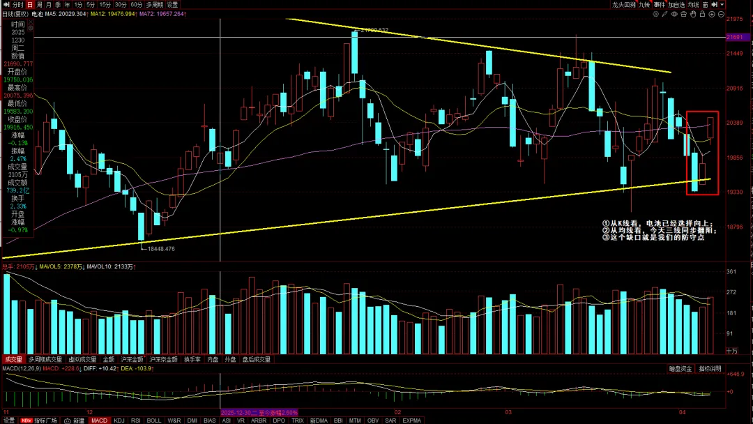 总结一下:①从子母孕育线突破上周五K线高缘来看,电池已经选择向上;②从均线看,今天三线同步扬升;③这个缺口就是我们的防守点,要是补了,前面的形态就基本失效。