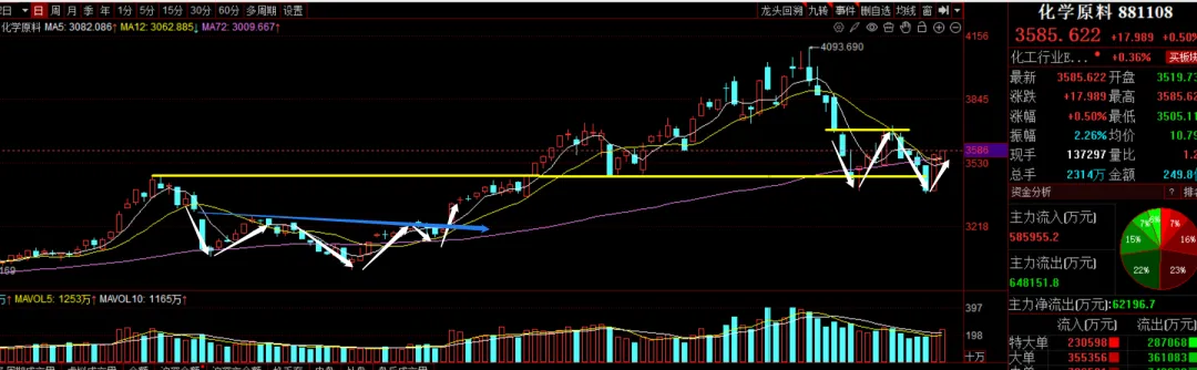 上面跟大家说过,大盘底部太虚,头重脚轻站不稳,但化学原料不一样,它的底部比头部扎实多了,走势延续性也更强。上一次它也是形成了三重底的扎实架构。