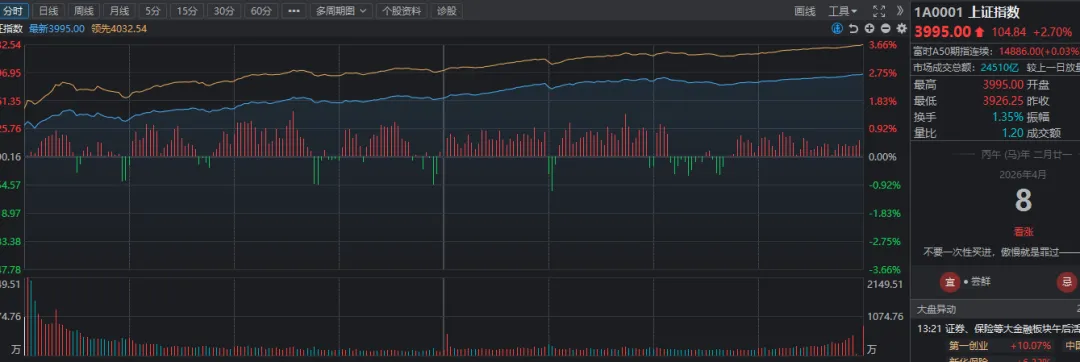 【2026年4月8日A股市场行情快报】A股放量大涨2.70%,成交额突破2.4万亿!