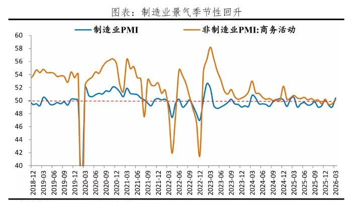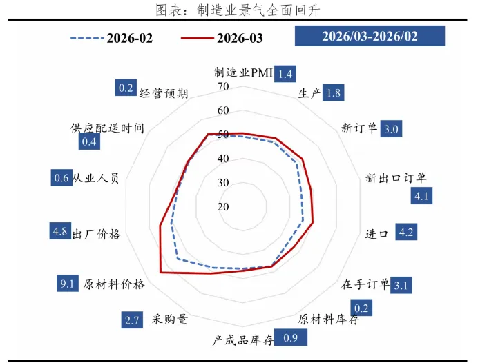 第六,外需边际改善,欧美制造业动能回升。1-2月出口同比高增21.8%,3月新出口订单指数回升4.1个百分点至49.1%,验证出口韧性;2月摩根大通全球制造业PMI较上月上升1.0个百分点至51.9%。3月美国制造业PMI为52.4%,欧元区制造业PMI升至51.4%,创45个月新高。