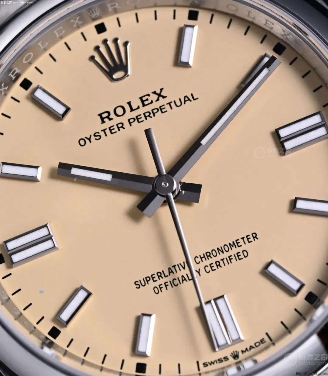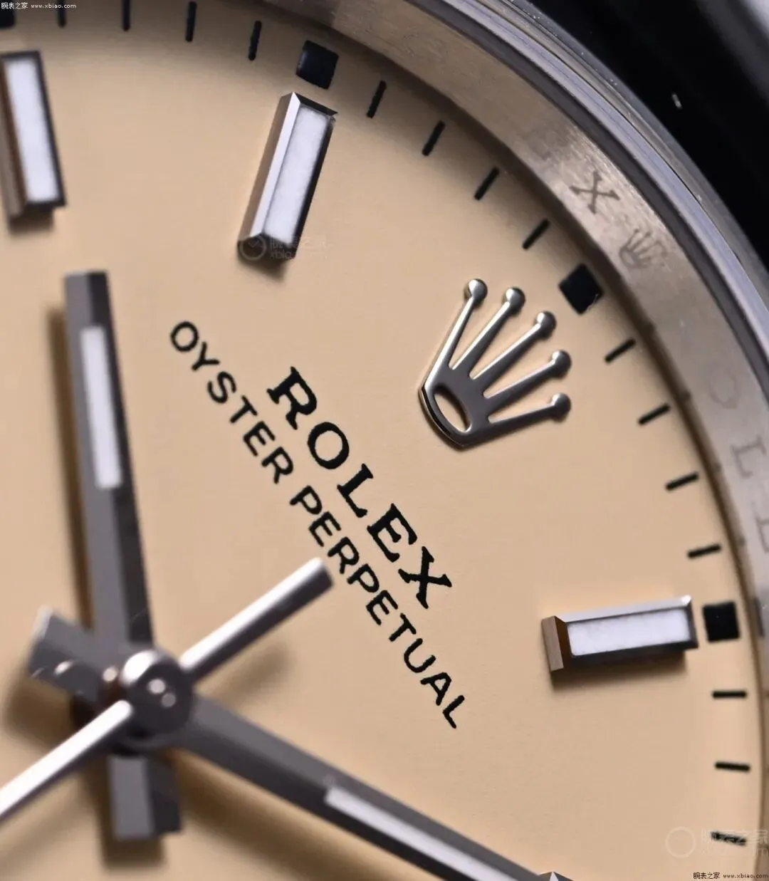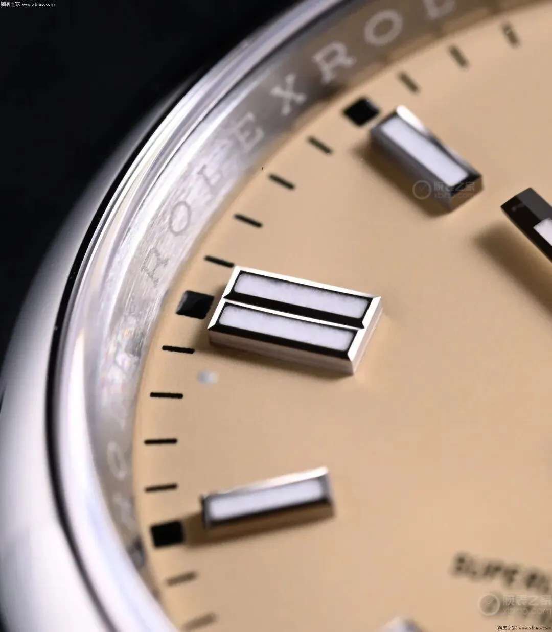 ▲劳力士蚝式恒动,沙漠黄,盘面细节