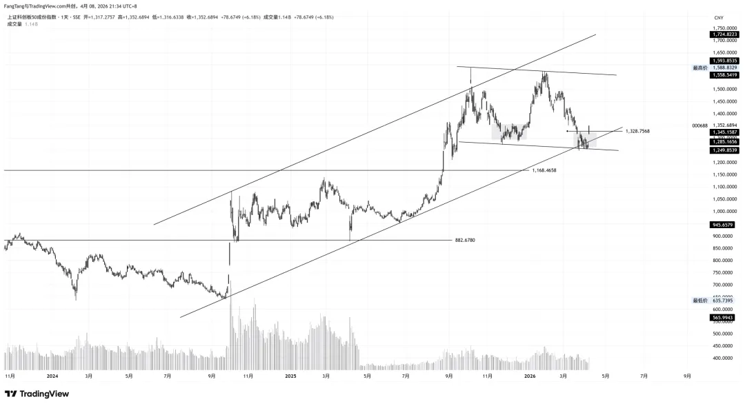 科创50,对于科创板,其实也是一贯的。前面第一次在1350尝试,止损后在1270附近尝试。考虑有一个跟上一波类似的小区间之后,站上站稳,确立大级别低点基本成立。