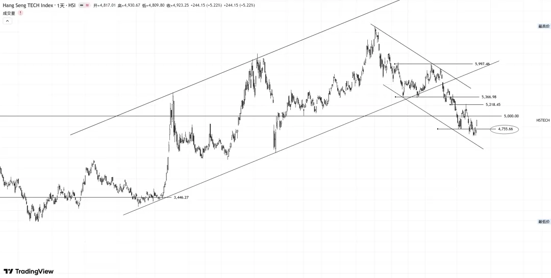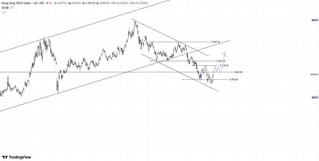恒生科技,这个玩意呢。观点也是一贯的,倾向于这是大级别底部的位置,需要震荡更久的时间。前面试了好几次了,这两天是说重新站上4750再来。目前是已经站上来了,好事情!