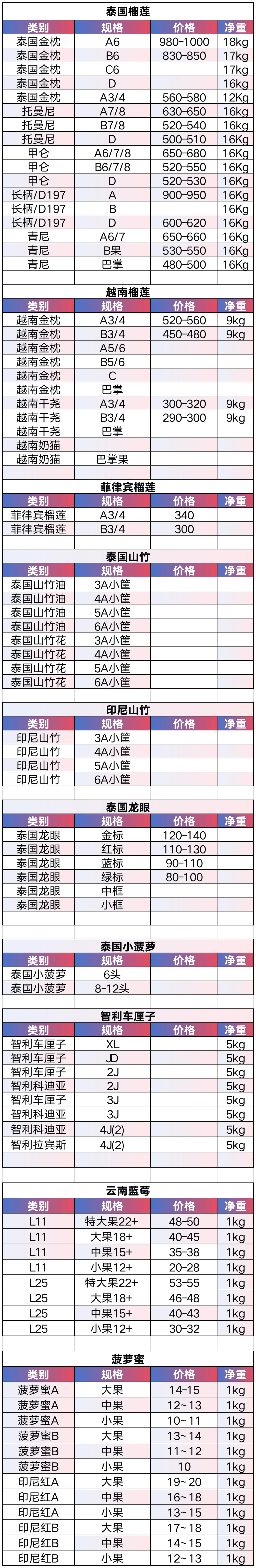 泰国金枕掉价,A6/19KG走在950-1000左右,合净果28-29.5/斤。甲仑A6-7/16KG走在650-670,A4/8-8.5KG走在340-360,合23-24/斤。托曼尼走得慢,价格乱,A4/8KG走在250-270左右,16KG走在530-550,合18-19/斤