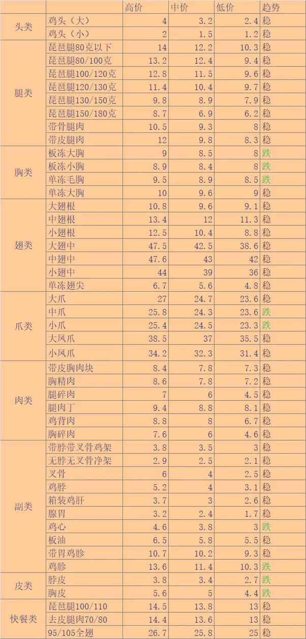 | 微评:今日大肉食毛鸡报价稳定。节前毛鸡扎堆出栏,节后屠企开工率提升,经销端正常走货,鸡源出现短暂缺口。但是需注意后续产品走势仍有持续下滑压制毛鸡行情的风险。注:各地毛鸡以实际成交为准,其中活禽交易价格差异大。实际局部根据产品行情、消费、毛鸡出栏现状分析,实际收购价格与报价有一定差距,价格只供参考。 |